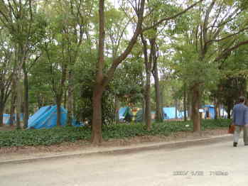 Park hausten unter blauen Regenplanen und